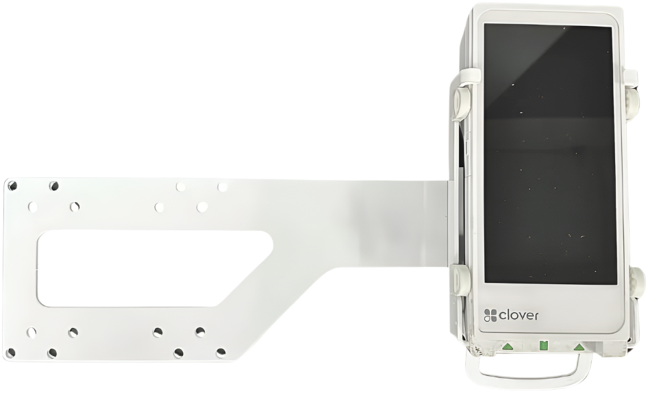 This a custom bracket that brings the Clover Flex 3 POS device next to the 19" - 23" Tablet. The bracket, made of metal with white coating is secured to the back of the monitor and projects to the left or the right of the monitor.